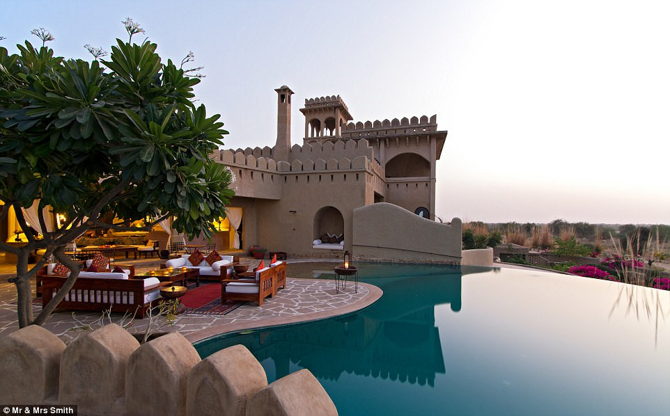 Mihir Garh, Jodhpur, Ấn Độ: Hồ bơi tại khách sạn Mihir Garh giữa sa mạc rộng lớn có hình dáng đặc biệt và là điểm nhấn của tòa nhà. Bể bơi có tầm nhìn 180 độ về phía đồng cỏ sa mạc, đồng thời, là điểm đến của những loài chim hoang dã khi hoàng hôn.