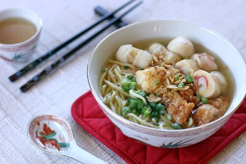 Thử những món ăn vặt trên phố Jishan là một hoạt động thú vị khi ghé thăm Jiufen, đặc biệt là món ngon nổi tiếng như súp cá viên, bánh khoai môn và nấm nướng. Cá viên có màu trắng, trông giống mọc và thường được ăn chung với mì gạo. Ảnh: angsarap