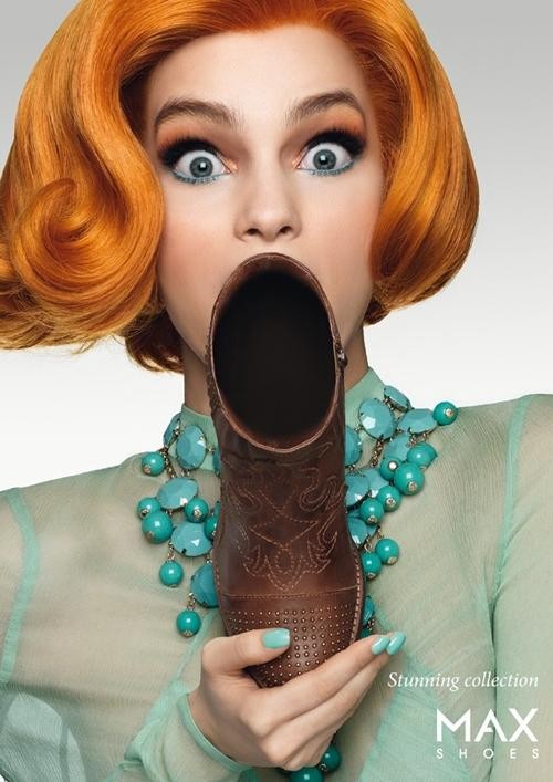 Chiếc giày chứa đựng sự ngạc nhiên của Max Shoes rất dễ khiến người ta hiểu nhầm. Vị trí gần miệng cô người mẫu thể hiện sự sắp đặt hết sức tài tình của tác giả.