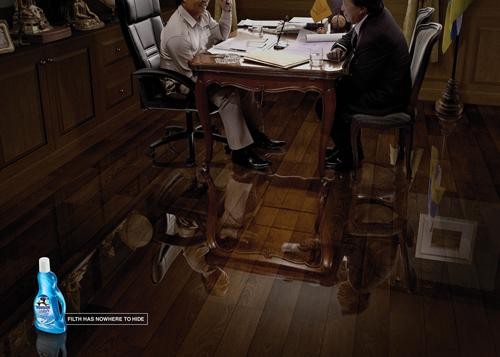 "Rác rưởi không có chỗ để lẩn trốn" (chủ ý bao gồm cả bụi bẩn và trò hối lộ mờ ám). - Một quảng cáo đầy thông minh của nước lau sàn Penguin tại Thái Lan, nhất là trong bối cảnh nước này đang dương cao lá cờ chống tham nhũng.