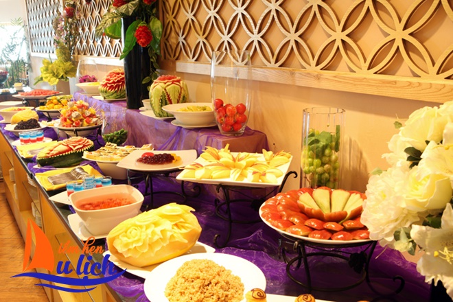 Khu Tráng miệng hấp dẫn bởi màu sắc của các loại bánh và hoa quả tươi