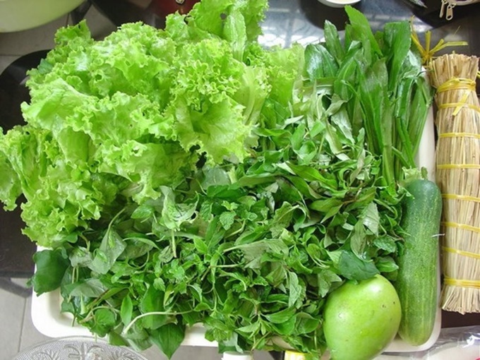 Việc đầu tiên trong khâu chuẩn bị là rửa rau thật sạch, rau muống thì ngắt bớt lá chỉ lấy phần non để khi kèm món chính sẽ giòn hơn. Xoài thì nên chọn quả xoài còn non và xanh để khi ăn cho vị chua đúng chuẩn. Lấy một củ khoai lang vàng đem luộc chín. Phần thịt heo phải chọn phần thịt có nạc có mỡ để ăn thêm béo, luộc chín và cắt lát mỏng. Nhớ phải chuẩn bị thêm ít bún tươi để ăn kèm.