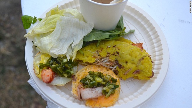 Chiếc bánh mỏng giòn được chế biến từ thịt heo, tôm, giá đỗ và ăn kèm các loại rau thơm. Bánh xèo là một trong những món ngon đích thực của ẩm thực Việt.