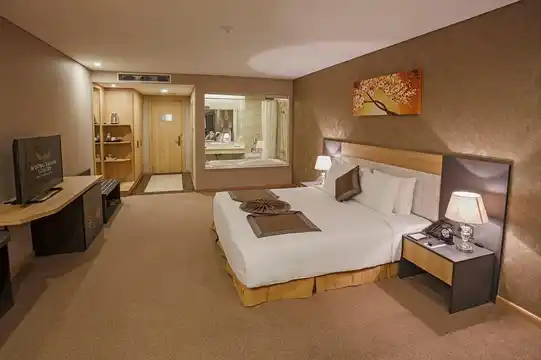 - Trong hệ thống phòng nghỉ, khách sạn cũng cung cấp các loại phòng hạng sang cho khách hàng có nhu cầu. Diện tích của các phòng này thì rất lớn, từ 120m2 - 425m2, bao gồm: Grand Suite, Royal Suite và Presidential Suite. Hai loại phòng Grand Suite và Royal Suite có các tiện ích tương tự nhau với 1 giường đôi, phòng tắm lớn có bồn tạo sóng thư giãn, view phòng hướng biển hoặc nhìn ra thành phố. Điểm khác biệt là phòng Royal Suite có diện tích 160m2 lớn hơn phòng Grand Suite (120m2).