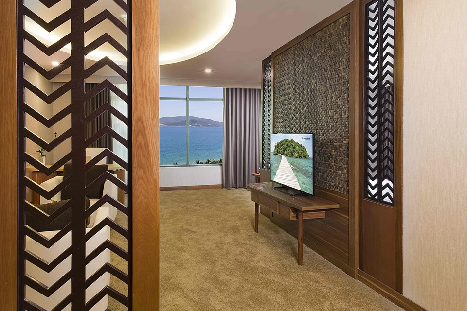 Phòng Executive Suite có diện tích lớn nhất, thiết kế sang trọng với một phòng khách riêng biệt, phòng ngủ có vách kính rộng giúp du khách có tầm nhìn bao quát vịnh Nha Trang. Hai loại phòng còn lại có view hướng biển hoặc thành phố, tùy vào lựa chọn của khách du lịch.