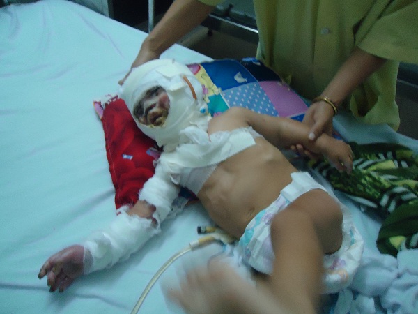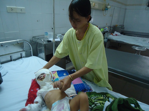Đến hỏi thăm em, trước mắt chúng tôi là hai vợ chồng người dân tộc đang bồng bế trên tay đứa bé quấn băng trắng toát toàn thân. Khuôn mặt bé đen sẹm, chỉ hở ra hai con mắt, lỗ mũi và một phần miệng khiến cho bất cứ ai nhìn thấy cũng đều phải rùng mình, sợ hãi.