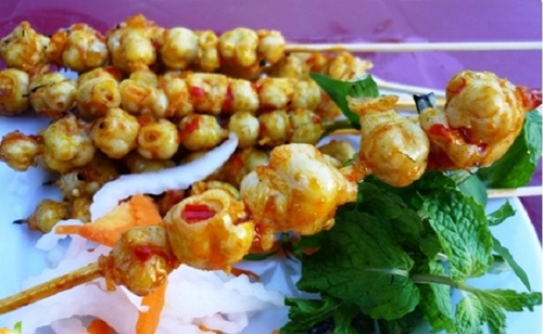 Răng mực là phần tròn tròn, nhỏ xíu trên đầu mực thường bị nhiều người nhầm tưởng là mắt mực hay miệng mực. Răng mực được tẩm ướp gia vị, xiên que và nướng trên than hồng, ăn kèm với dưa góp và rau sống. Món ăn này có độ dai sần sật khó quên. Mỗi xiên răng mực nướng có giá khoảng 10.000 đồng, nên thử trên đường Nguyễn Tất Thành, Võ Thị Sáu, gần ga Phan Thiết... Ảnh: Phanthietvn