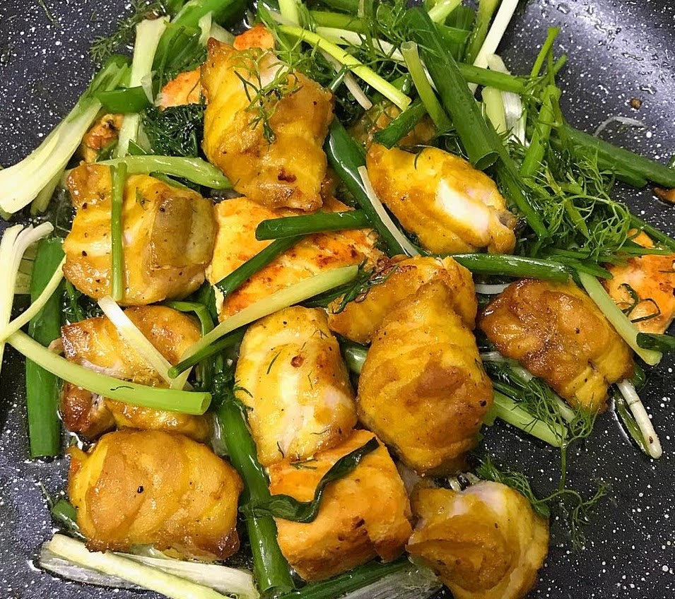 Cho 2 muỗng dầu ăn hoặc mỡ nước vào chảo trên bếp, bỏ chả cá đã nướng vào và chiên cho vàng đều ở 2 mặt. Sau đó cho hành và thì là vào, đảo nhẹ chảo để rau chín rồi tắt bếp.