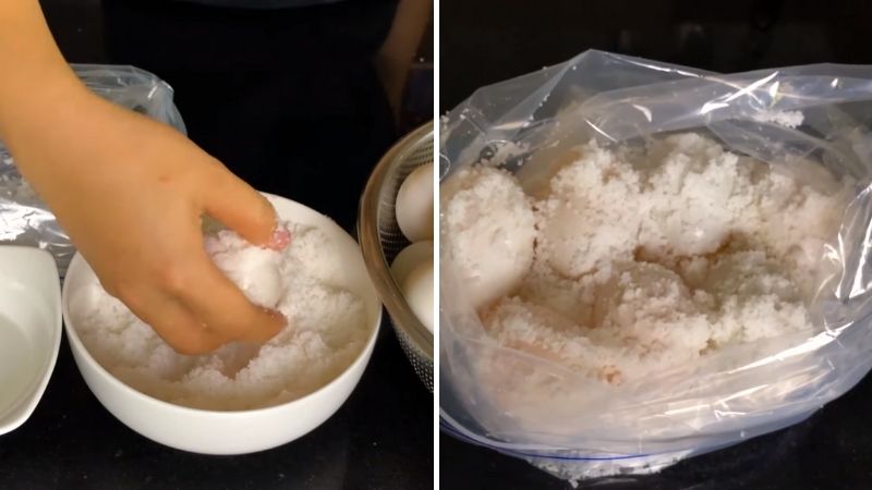 Bước 3: Chuẩn bị một bát muối, lăn trứng sao cho muối phủ kín bề mặt trứng. Làm lần lượt đến khi hết số trứng đã chuẩn bị.