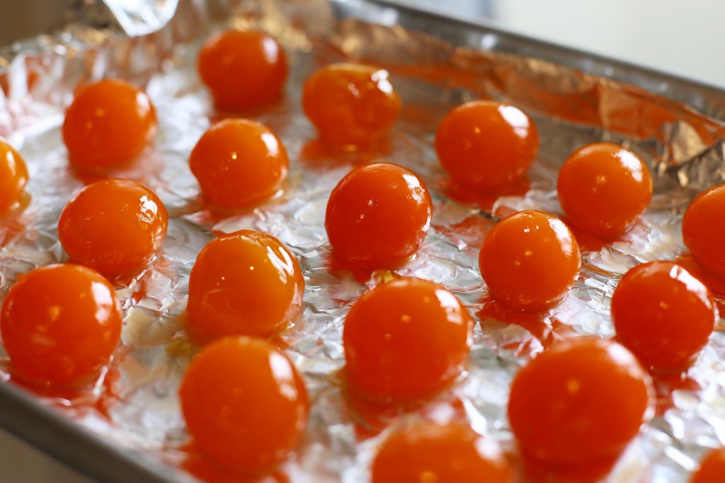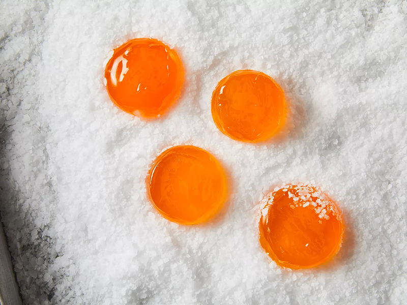 Bước 3: Chuẩn bị muối ra một cái khay, gạt bằng sau đó tạo các vết lõm. Đặt các lòng đỏ đã tách trên các vết lõm sau đó phủ thêm một lớp muối mỏng lên bên trên.