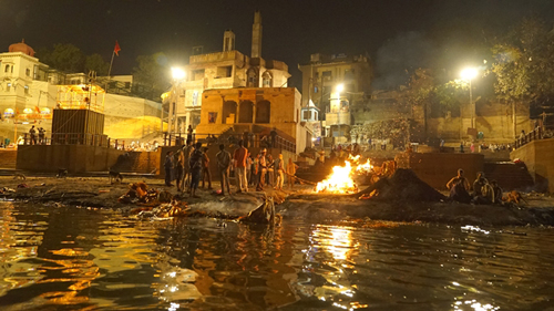 Người dân đang hỏa táng người chết bên bờ sông Hằng.