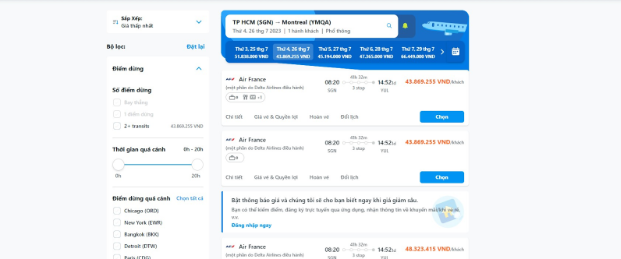 Với đường bay từ Thành phố Hồ Chí Minh (sân bay Tân Sơn Nhất) đến Montreal, Canada sẽ có 2 điểm quá cảnh. Với các hãng bay cung cấp đường bay này như: Air France, United Airlines, Lufthansa,.... Mức giá dao động từ 43.000.000 VND/vé/chiều bay đi.