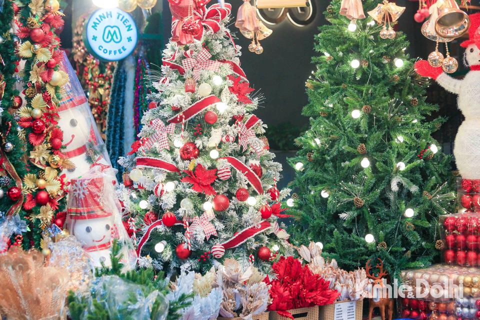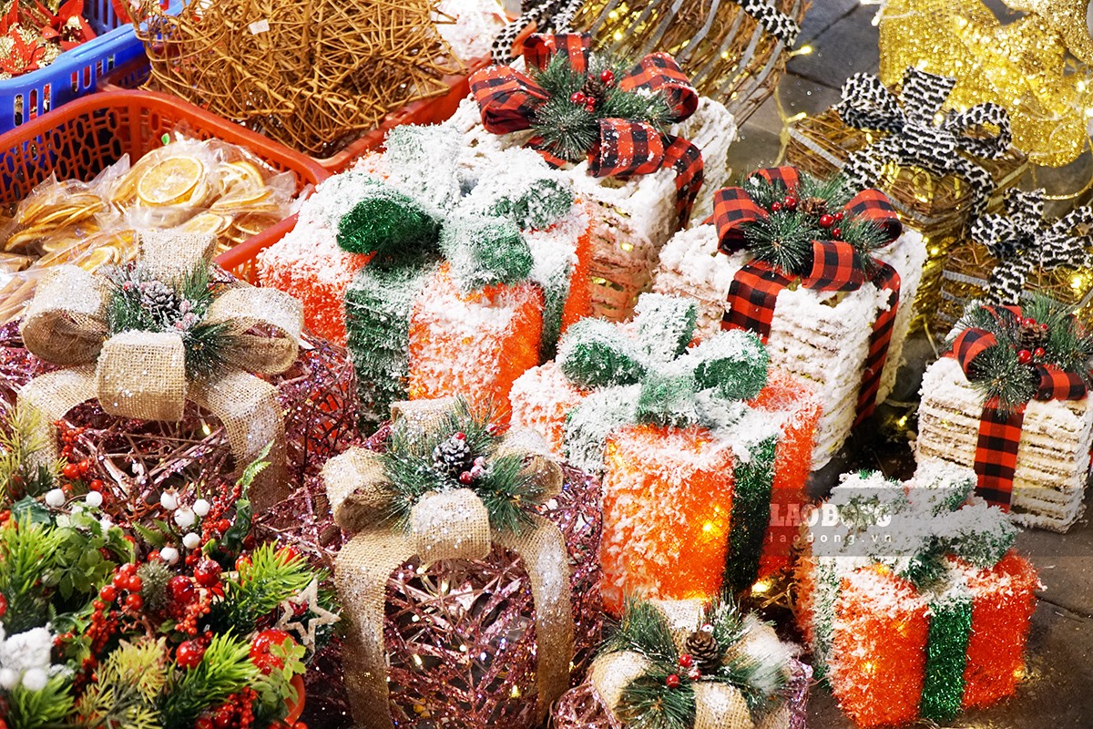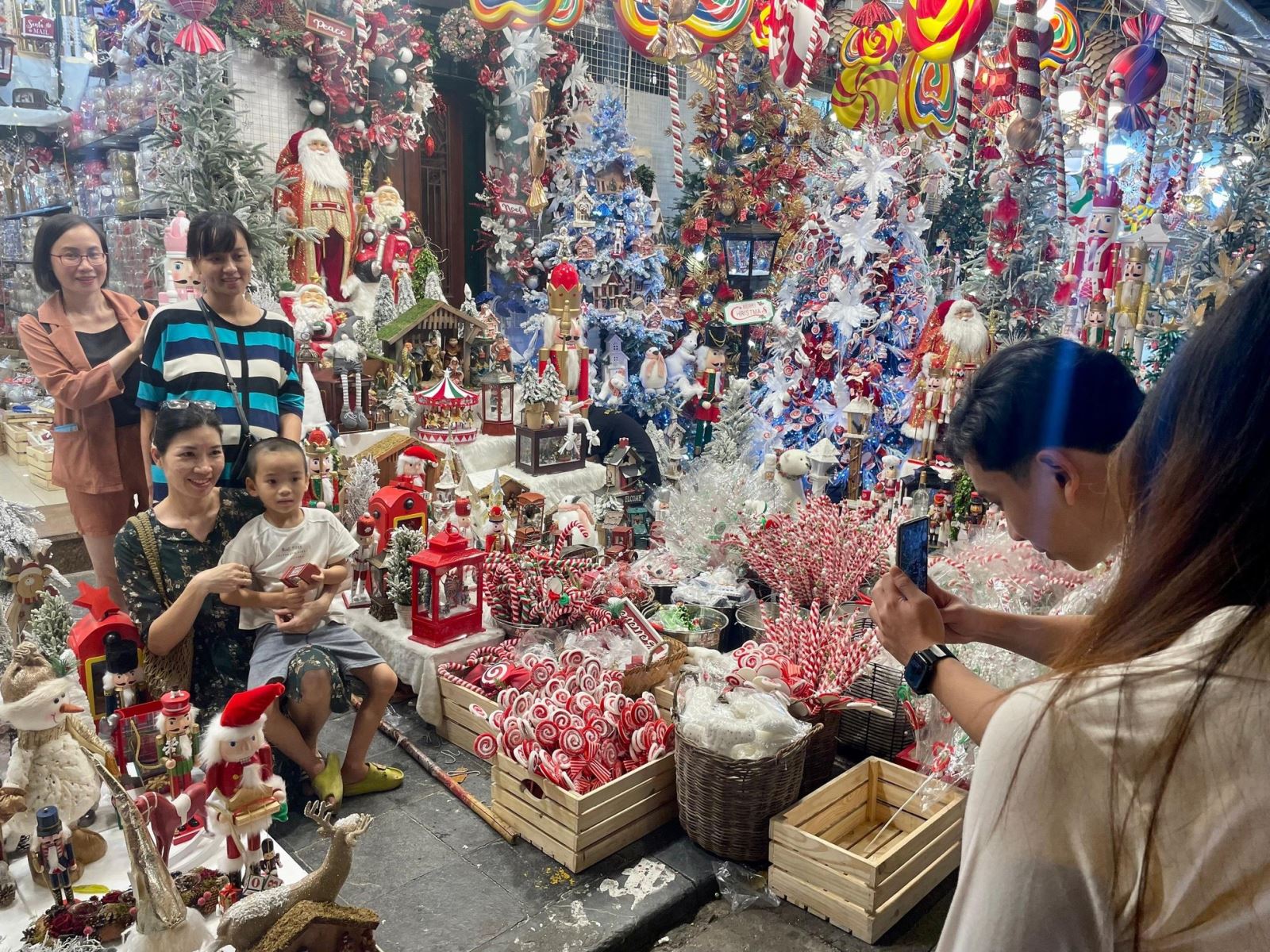 Rất nhiều cửa hàng bán đồ trang trí Giáng sinh trên con đường chỉ vài trăm mét, nên đến đêm, khi phố lên đèn thì nơi đây rực sáng lung linh. Mặt hàng thì phong phú như vòng hoa thông treo cửa, hoa tuyết, quả chuông, viên kẹo, kẹo hình gậy, ông già Noel, mũ ông già tuyết… thậm chí là mô hình hang đá thu nhỏ đều có. Giá cả theo đó cũng đa dạng, từ vài ngàn đồng đến những món hàng trị giá mấy chục triệu đồng đều có sẵn, tùy vào nhu cầu của bạn. Màu sắc chủ đạo trên các cửa hàng là màu của Giáng sinh gồm đỏ, trắng, xanh lá. Ngoài ra còn rất nhiều phụ kiện óng ánh vàng, xanh biển trông rất thu hút.