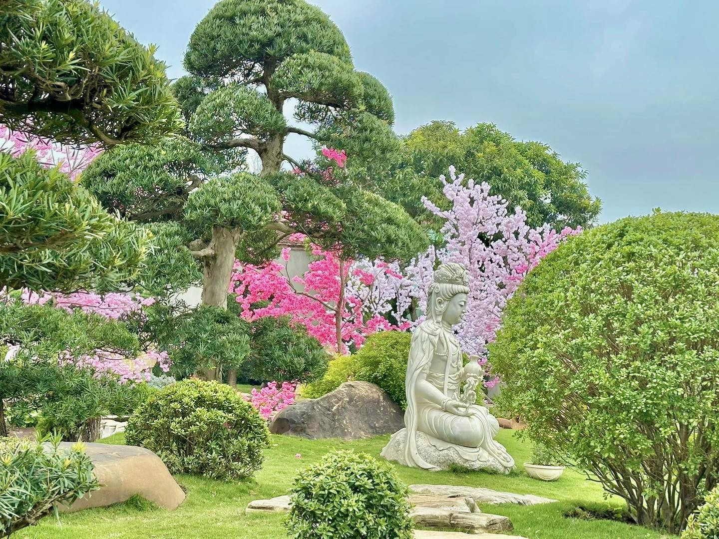Khi đi qua cổng chính của chùa, du khách sẽ đến khu vực khuôn viên sân chùa rộng rãi và thoáng đãng, với nền sân lát xi măng phẳng. Dọc hai lối đi dẫn vào tòa Tam Bảo là hai dãy tượng Phật Quan Âm và Phật Di Lặc. Cả hai tượng đều có nét mặt hiền hậu nhưng vô cùng trang nghiêm.
