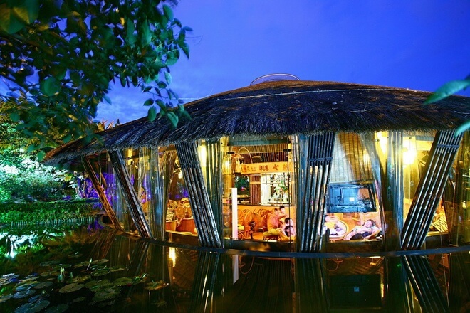 Hệ khung cột – mái được tạo tác từ những cây tre, mái lợp lá tạo nên nét độc đáo và cảm giác gần gũi. Mặt nước có tác dụng điều hoà không khí và nhân đôi hình ảnh khiến công trình trở nên lung linh