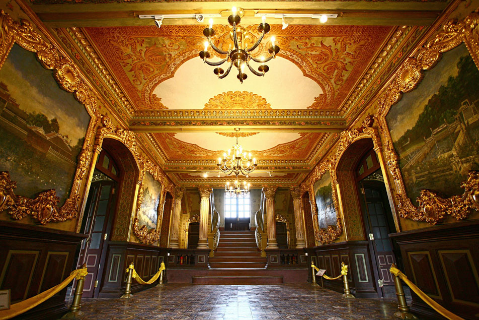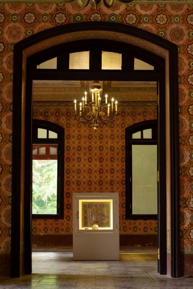 Một chiếc ghế sơn son thiếp vàng, chạm khắc tinh xảo trong phòng ăn. Họa tiết trang trí trần nhà mang mang hoa văn cùng đèn chùm (chandelier) thắp sáng gian phòng