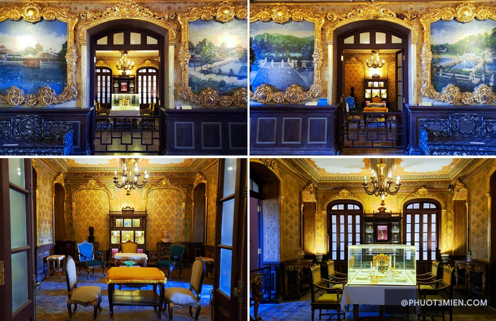 Được biết, điểm nhấn ở sảnh chính lầu 1 chính là bộ 6 bức tranh sơn dầu được vẽ trực tiếp lên tường mô tả lăng của các vị vua Gia Long, Minh Mạng, Thiệu Trị, Tự Đức, Đồng Khánh và Khải Định.