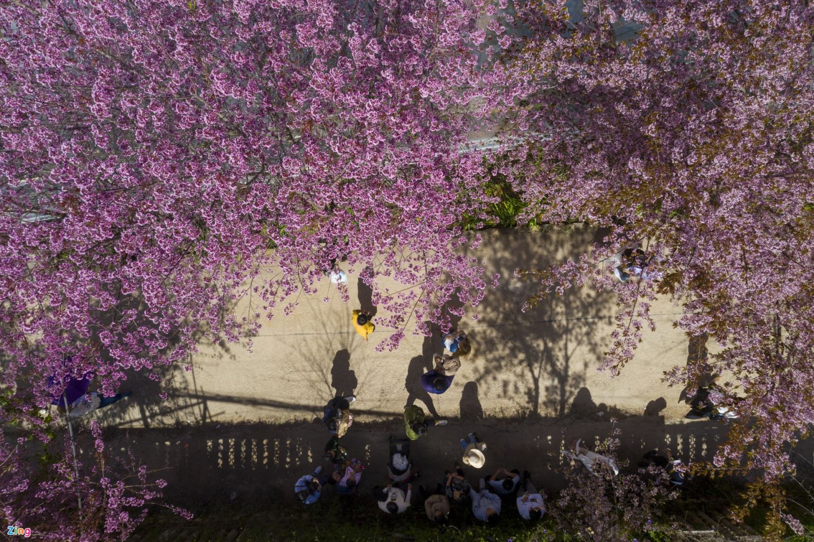Năm nay, đoạn đường Hùng Vương và hướng đi ga Trại Mát là địa điểm được nhiều khách du lịch lựa chọn check-in cùng loài hoa đặc biệt này. Du khách MaiKa Nguyễn (Nha Trang) chia sẻ cô biết đến cung đường hoa mai đào này qua những bài giới thiệu trên mạng xã hội. "Tôi dự định ở Đà Lạt trong 3 ngày và sẽ dành trọn thời gian này để tìm kiếm những góc check-in đẹp cùng với loài hoa này", nữ du khách bày tỏ. Tương tự, vợ chồng du khách Văn Công - Cẩm My (Hưng Yên) cũng biết đến mùa hoa mai anh đào nhờ vào bài chia sẻ trên mạng xã hội. Ngay lập tức, hai vợ chồng đã đặt vé máy bay vào Đà Lạt để kịp ngắm hoa trong thời gian nở rộ. Chị Cẩm My còn đầu tư thêm một bộ kimono để chụp hình. Ngoài nữ du khách trên, Kim Ngân (du khách Bình Dương) cũng chọn cổ phục, giúp các bức ảnh ấn tượng hơn.