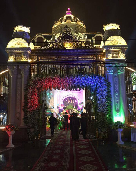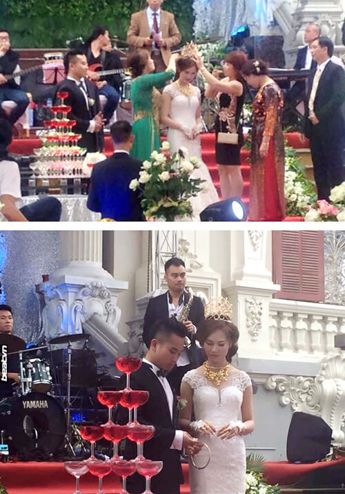 Đám cưới rình rang này diễn ra trong ba ngày liền, từ 1/4 đến 3/4 vừa qua, được tổ chức tại tòa lâu đài hoành tráng có tên Lan Khoa Khuê ở huyện Hải Hậu. Theo người dân xung quanh, đây là đám cưới của con trai út một đại gia tàu biển. Vị đại gia đã mạnh tay chi tiền mua cho con dâu một chiếc vương miện bằng vàng. Chiếc này là chiếc thứ hai ông từng đi mua về cho con dâu.
