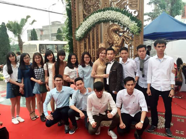 Cô dâu chụp ảnh với bạn bè cùng lớp.
