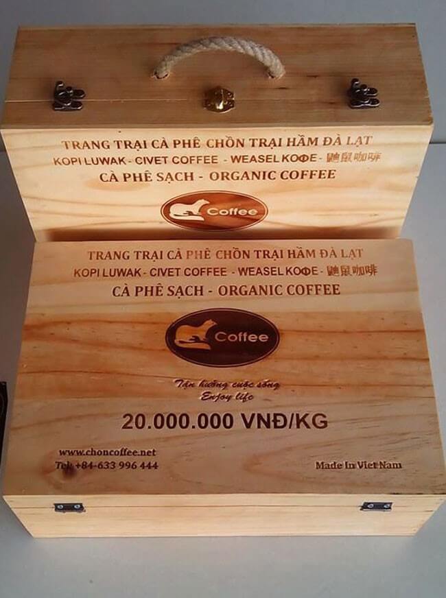 Hộp quà gỗ dành cho khách hàng mua 1 kg cà phê chồn có kèm máy nghiền và bình pha.