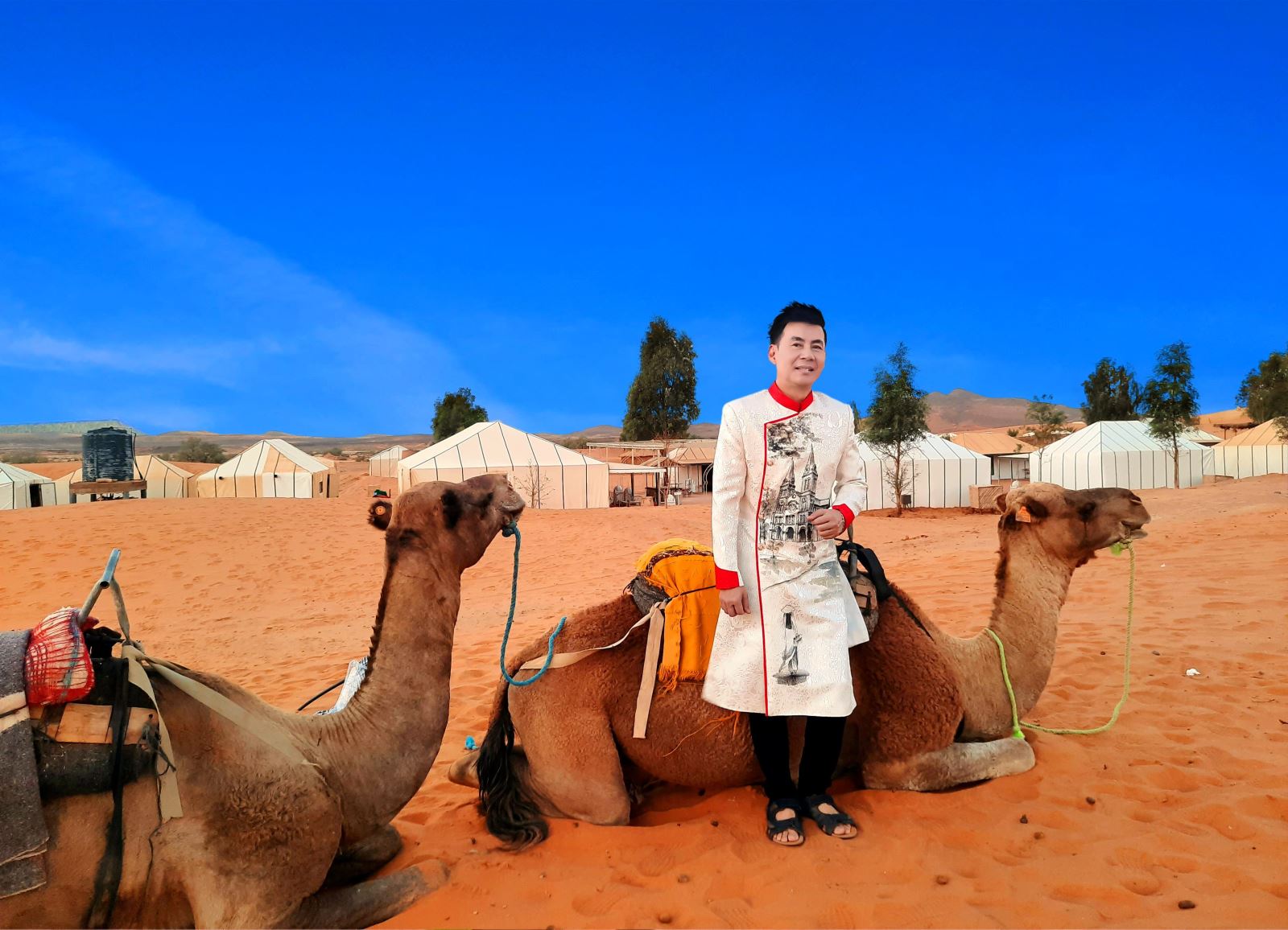Sau đó, vào cuối năm 2023, Đoan Trường hào hứng khoe áo dài có vẽ biểu tượng Nhà thờ Đức Bà khi đón hoàng hôn trên sa mạc Sahara lớn nhất thế giới tại Ma Rốc dưới cái nóng hơn 40 độ C.