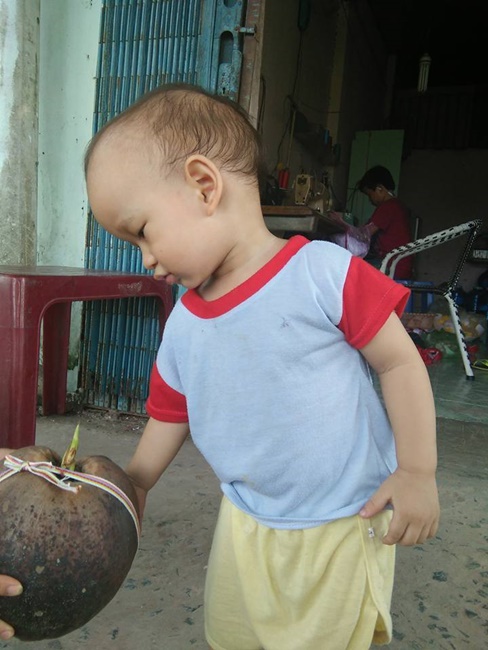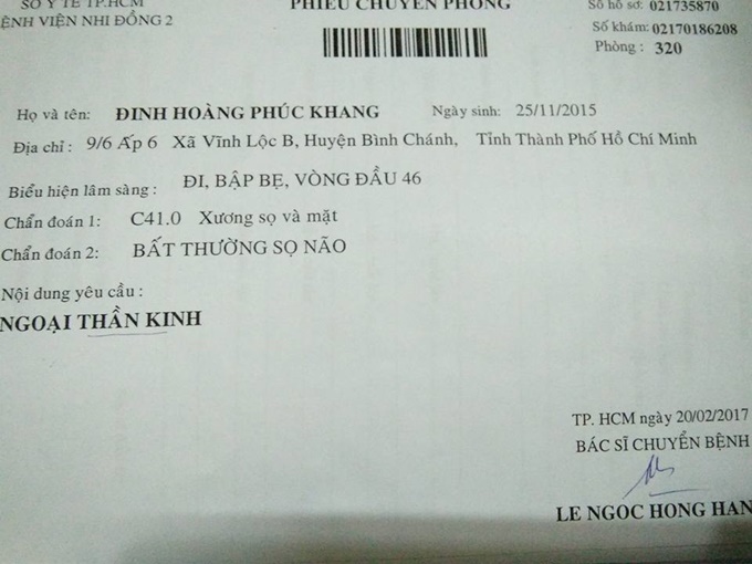 Cháu Đinh Hoàng Phúc Khang, giới tính nam, 18 tháng tuổi ngụ tại F9/ấp 6-Hương lộ-80 Vĩnh Lộc A, Bình chánh đang mắc bệnh dị tật bẩm sinh não - dính khớp sọ dọc.