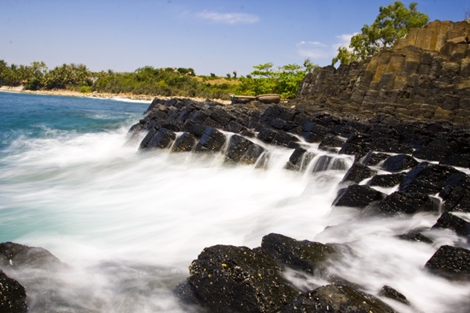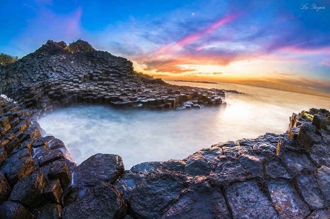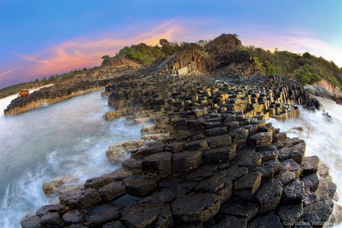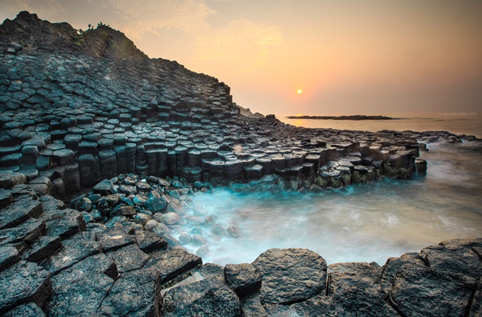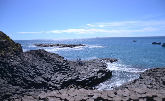 Bãi đá với hàng nghìn, hàng nghìn những phiến đá ấy, óng lên màu đen huyền bí nổi bật giữa nước biển xanh ngắt và những con sóng vỗ trắng xóa. Những trụ đá hoặc nghiêng nghiêng theo thế tiến ra biển, hoặc xếp thẳng đứng chồng chất lên nhau, cao thấp khác nhau tựa như những chồng dĩa được xếp ngay ngắn.