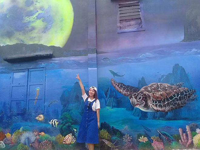 Với 14 bức tranh 3D được vẽ lên tường với đủ màu sắc vô cùng sinh động, giúp làng chài Bình Sơn thêm hút hồn du khách.
