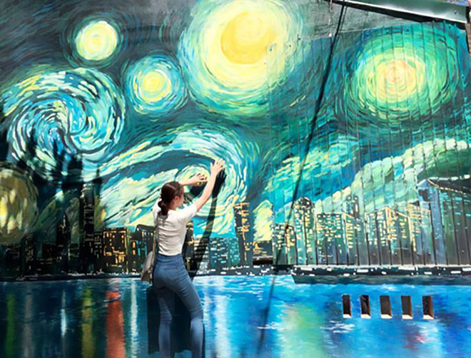 Về đêm, khi thắp điện lên, những bức tranh 3D cộng hưởng ánh đèn phát sáng tạo không gian lung linh, kỳ ảo.