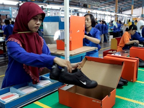 Công nhân đóng gói giày tại một nhà máy Nike ở Tangerang, tỉnh Tây Java, Indonesia. Bằng việc tăng lương và minh bạch hơn về các quy phạm lao động, Nike đã dần lấy lại được hình ảnh.