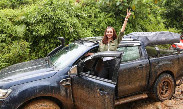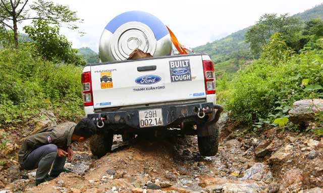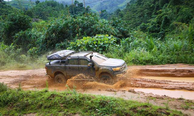 Khi vượt qua thử thách này thì thử thách khác lại ập tới. Một cơn mưa ập xuống làm mặt đường trơn trượt và hố bùn khủng khiếp. Vào thời điểm đó, những chiếc xe bán tải mạnh mẽ của đoàn đã phát huy tác dụng. Ford Ranger Wildtrak sở hữu khung gầm bằng thép chịu lực siêu cứng cùng hệ thống treo ưu việt cho phép xe lướt nhanh mà vẫn êm ái qua các cung đường khúc khuỷu. Bên cạnh đó, ở những khu vực cheo leo, những công nghệ như Hỗ trợ khởi hành ngang dốc, Chức năng hỗ trợ đèo dốc HDC hay Hệ thống chống trượt giúp xe giữ được sự ổn định xuyên suốt hành trình. Các khu vực ngập nước cũng trở nên đơn giản hơn rất nhiều khi chiếc bán tải đến từ Hoa Kỳ đạt thông số kỷ lục 800mm chịu ngập.