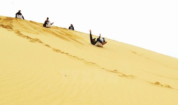 Đến với đồi cát Phương Mai, du khách còn được trải nghiệm mới với trò chơi cảm giác mạnh như trượt cát ở độ cao 100 m và tốc độ trượt khoảng 30 km/h.