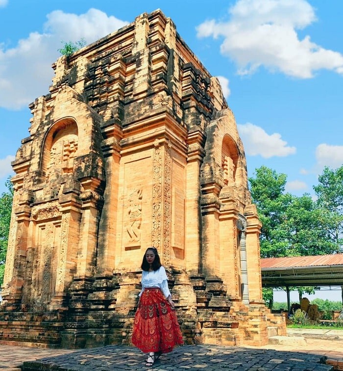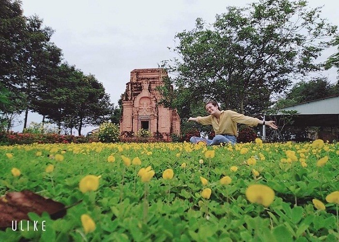 Bên cạnh đó, toàn bộ khu tháp được xây dựng trên một gò đất hình chữ nhật dài 70m và rộng 65m, bên ngoài thì là cánh đồng lúa mơn mởn, bên trong là khu vườn rực rỡ sắc hoa, vì vậy sẽ rất tuyệt để bạn có được những bức hình sống ảo xịn sò cho xem.