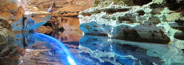 ![Một người tìm kiếm kim cương tình cờ tìm thấy hồ nước tàng hình trong hang động Poco Azul.]()