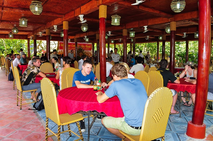 Về ẩm thực nơi đây, điều làm du khách thích mê là được thưởng thức những món ăn đặc sản sông nước miệt vườn : cá tai tượng chiên xù, bánh xèo, xôi chiên phồng, gà nướng lu, đuôn dừa chiên bơ... đều được các đầu bếp nhà hàng thực hiện tỉ mỉ theo kinh nghiệm dân gian với lợi thế nguyên vật liệu tươi sống có sẵn tại địa phương nên các món ăn luôn đảm bảo về sự tươi, ngon, dinh dưỡng cao.