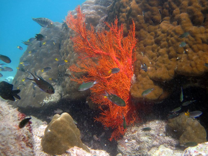 Giữa trưa, chúng tôi đeo kính lặn và ống thở, thả người xuống biển xanh. Khi chúng tôi tiến ra ở độ sâu chừng 5m, dưới đáy biển là những chùm san hô nhỏ loại sừng màu vàng, trắng cùng với loại giun nhiều tơ nằm rải rác trong những hốc đá. San hô vùng này đang hồi sinh.