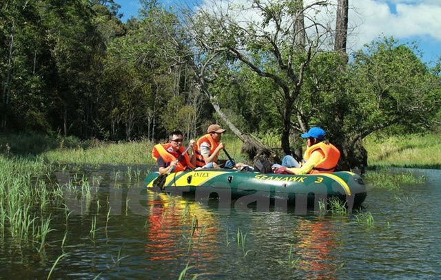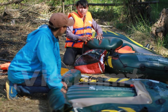 Muốn đến rừng phong, chúng tôi phải chèo thuyền cao su khoảng hơn 1km. (Ảnh: Xuân Mai/Vietnam+)