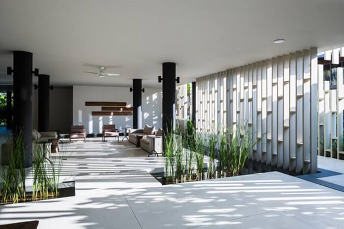 Ngay tầng trệt có không gian mở được bao quanh bởi khu vườn treo thư giãn và ao sen. Một không gian mang đến sự thư giãn và yên bình gần như tuyệt đối.