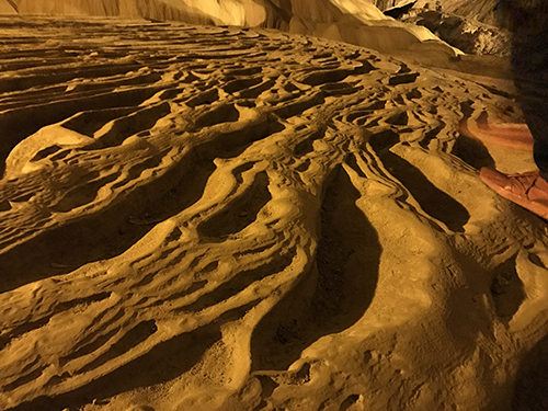 Tuyến tham quan trong động Ngườm Ngao có một đoạn du khách đi bộ ngay trên nền măng đá đang hình thành.