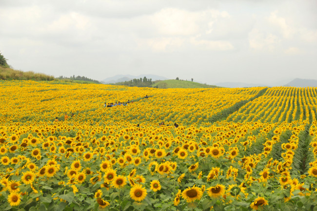 Màu vàng của cánh đồng hướng dương trải dài từ quả đồi này đến quả đồi khác, như là vô tận đến cuối chân trời.
