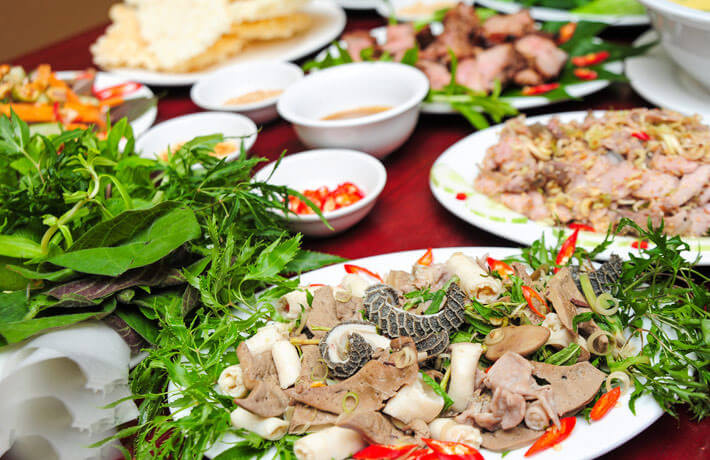 Những món ăn ngon với: cá sông độc đáo, món đồng quê đa dạng, hải sản tươi sống, tất cả đều sẽ được bày trí sang trọng trên bàn ăn trong một không gian nên thơ và đầm ấm tại Làng Nướng Muối Ớt Xanh