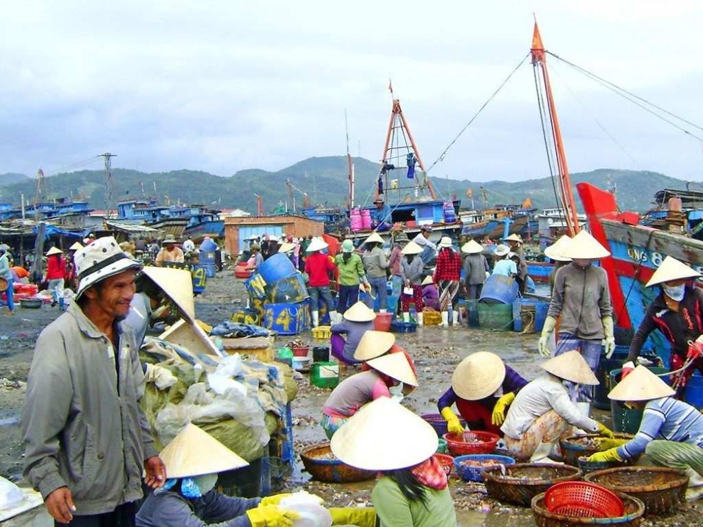 Từ trên cầu Thạch Đức, cây cầu bắc ngang qua đầm nước mặn Sa Huỳnh (nơi cung cấp nước cho cánh đồng Sa Huỳnh vựa muối của miền Trung), từ đây ta có thể phóng tầm mắt ra cảng cá. Cửa của đầm nước mặn cũng là cửa của cảng cá luôn. Cảng cá Sa Huỳnh cũng là một trong 2 cảng cá lớn của tỉnh Quảng Ngãi. Bà con ngư dân ở đây không chỉ sinh sống bằng nghề đi biển mà còn nuôi trồng các loài hải sản, nhiều nhất là hàu sữa và cá bớp. Đến đây nếu bạn muốn bát được thời điểm ghe vào, chợ họp đông nhất là từ 2 rưỡi sáng đến 4 giờ, ghe thường vào rất là sớm. Nếu 6 giờ mới tới thì bạn chỉ còn thấy các cô đang rửa và xử lý một số loại hải sản như mực hay xẻ cá khoai để phơi,... Người dân thường họp chợ rất sớm, hải sản sau khi được đưa lên bờ sẽ được các thương lái thu mua luôn và đưa lên chợ và các nơi tiêu thụ. Thường bạn sẽ không mua lẻ được ở đây mà sẽ phải sang các khu chợ để mua. Ở cảng cá Sa Huỳnh thì cũng như bao cảng cá, làng chài miền Trung khác, cũng những nghề đấy, cũng những hải sản đấy, bà con sống chủ yếu phụ thuộc vào biển cả. Nhưng sự khác biệt là đến với mỗi vùng đất mới bạn sẽ được tiếp xúc với nhiều người hơn, khám phá được thêm nhiều phong tục vùng miền, khác nhau ở cái nếp sống của con người nơi đây.