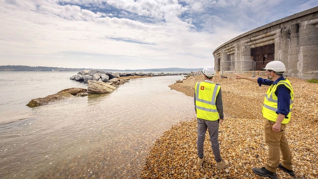 Ông Rob Woodside (phải) khảo sát các công trình phòng thủ biển với kè đá. (Ảnh: Sky News).