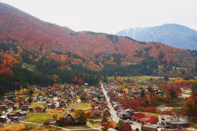 Ngôi làng cổ Shirakawago nằm dưới chân núi Hakusan, tỉnh Gifu, miền Trung Nhật Bản đẹp như cổ tích trong mùa thu. Từng mái nhà, khe nước, khoảnh sân trước vườn đều an nhiên, tự tại cả trăm năm qua như một thế giới riêng. Từ trên cao nhìn xuống, ngôi làng như là một Shangrila có thật với những mái nhà hình bàn tay đang cầu nguyện được ôm trọn bởi cánh rừng khoe sắc.