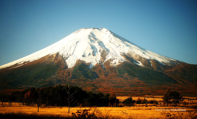 Núi Phú Sĩ, biểu tượng thiêng liêng của nước Nhật khoác lên mình vẻ đẹp lãng mạn khi thu về bởi rừng phong nhuộm vàng ôm trọn thân núi. Sắc vàng càng làm tôn lên vẻ đẹp huyền ảo của đỉnh núi được phủ tuyết trắng quanh năm.
