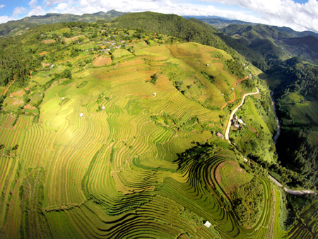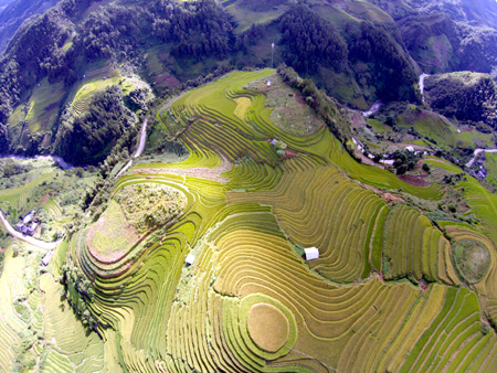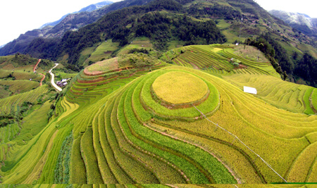 Giữa thu, núi rừng Mù Cang Chải hiện lên như một bức tranh vân núi khổng lồ với những thửa ruộng bậc thang xanh sắp đổ vàng tầng tầng, lớp lớp nối nhau như những nấc thang khổng lồ đổ xuống từ đỉnh núi, tựa những mâm xôi. Đẹp và quyến rũ đến nao lòng mùa lúa chín, lúc mà hương sắc của “biển vàng” này cứ cuồn cuộn tỏa hương khắp núi rừng. Đã không biết bao lần tới xứ Mù Cang, mà mỗi lần đến lại một lần rung động, xao xuyến như buổi đầu hẹn gặp người yêu.