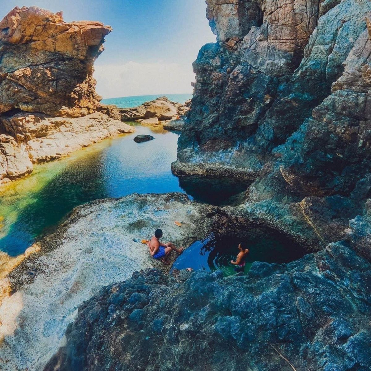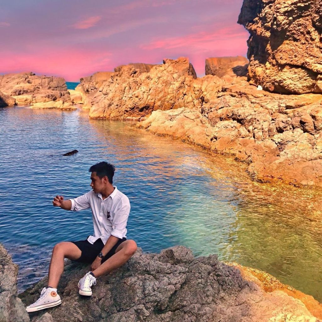 Địa điểm được check-in nhiều nhất chắc chắn là hồ nước xanh ngắt ngay giữa những mỏm đá. Nhìn giống như một hồ bơi thiên nhiên nằm ngay giữa biển. Sở dĩ dòng nước ở đây trong xanh đến vậy là do vị trí đắc địa lại được bồi đắp thêm bởi con sóng xô qua kẽ hở của một miệng đá đọng lại. Đây sẽ là một địa điểm lý tưởng cho ra đời những bức ảnh sống ảo của bạn và trải nghiệm cảm giác bơi lội, khám phá những điều kỳ thú dưới lòng đại dương.