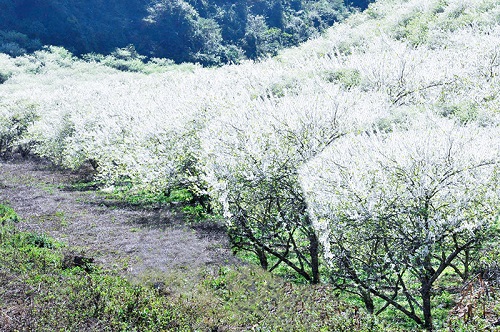 Vào thời điểm hoa mận nở rộ, sắc trắng của hoa phủ khắp các bản làng, các sườn đồi, hàng vạn cây mọc san sát nhau nên đúng vào thời điểm hoa mận nở là cả một đồi hoa như khoác thêm một chiếc áo mới tinh khôi trong nên trời xanh thẳm.