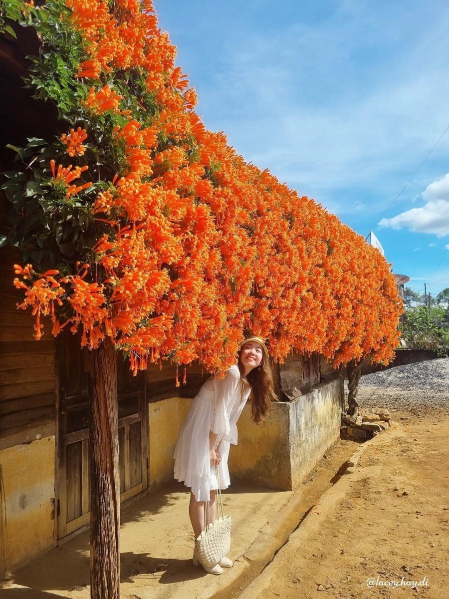 Ngân Bùi tiết lộ: "Ngôi nhà đẹp không những vì giàn hoa độc lạ, mà còn đẹp hơn bởi sự hiếu khách của chủ nhà. Hôm mình ghé nhà chơi, anh chủ rất nhiệt tình và hào hứng khoe về 'công trình', về quá trình chăm sóc kỳ công để cây ra hoa, và còn chỉ cho mọi người các góc đẹp để chụp hình kỉ niệm. Người Tây Nguyên là như vậy, hiền lành, dễ chịu như chính tiết trời mát mẻ tại đây".
